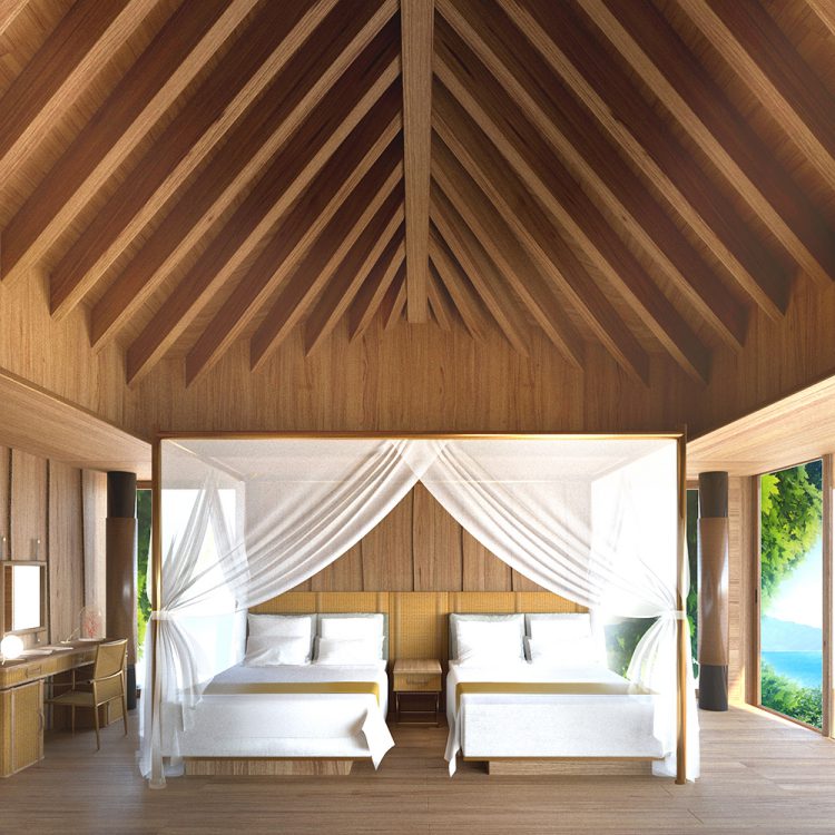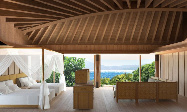 The architecture features ship-hull roofs employing the shipbuilding technology of the Murakami navy that long dominated the region. Bath huts and detached guest rooms are connected by the elevated decks passing through the trees. The interiors are composed around the theme of the trunk boxes, in which caravans once packed their daily necessities. It is a resort where guests spend time viewing tree-filtered sunlight and glitters of the sea from the tranquil forest.