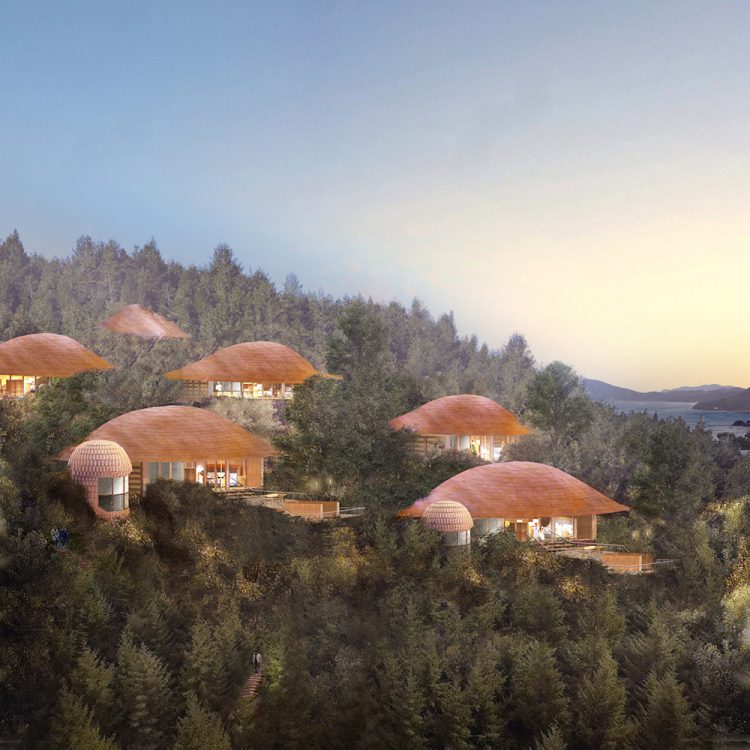 This is a new lodging facility under planning by a resort hotel located in Hiroshima prefecture. The facility will feature 11 blocks of 100m² standard rooms and 1 block of 200m² suite rooms on a sloped site of approximately 10,000m² enjoying views of islands in Seto Inland Sea. The region once served as a place for feudal lords, merchants, Korean envoys, Ryukyu missions, and Dutch traders to rest and recuperate during their long voyages.The lodgings, deliberately placed in a lush forest overlooking the ocean, provide hospitality to the caravans as they await favorable tides and winds.