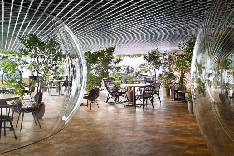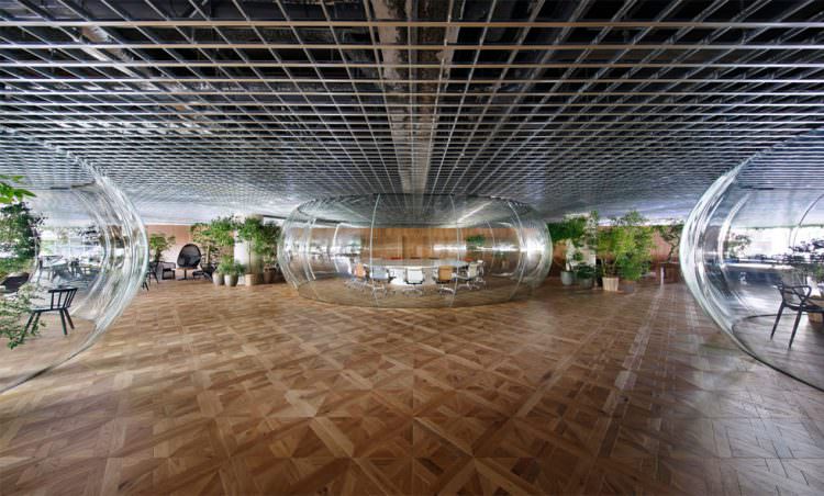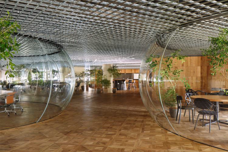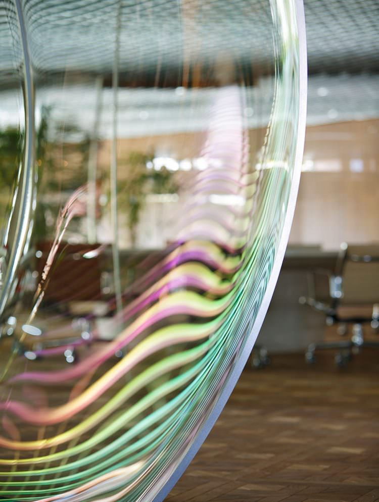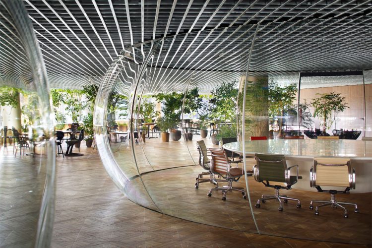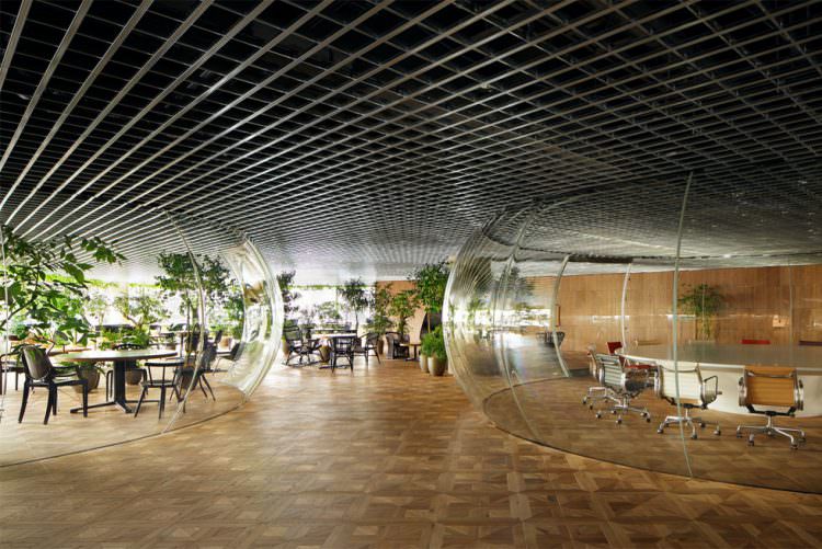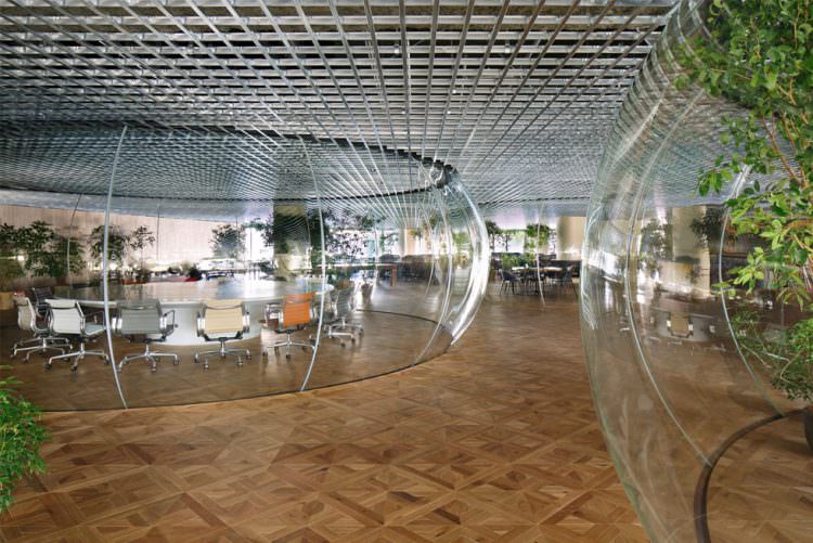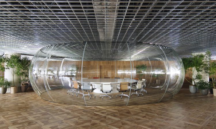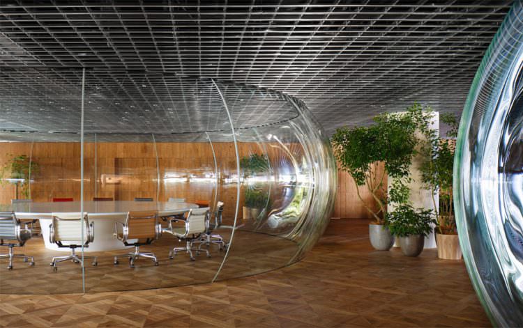 大会議室は空間全体の見通しを阻害しないように、透明な空気の膜のような空間とした。これは新幹線の操縦席で使われる風防ガラスを製作する職人による、三次元熱曲げによって制作。円卓で行われる議論の熱気で空気が膨張したような、活気に満ちた会議室である。
