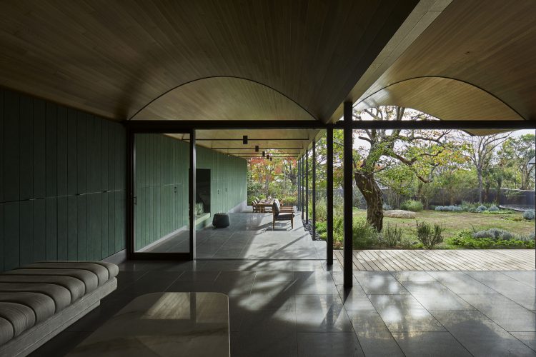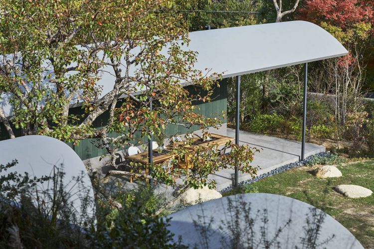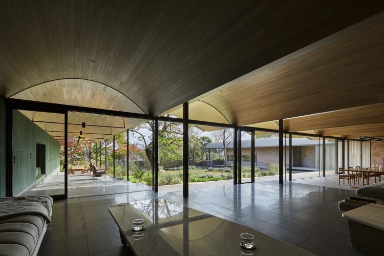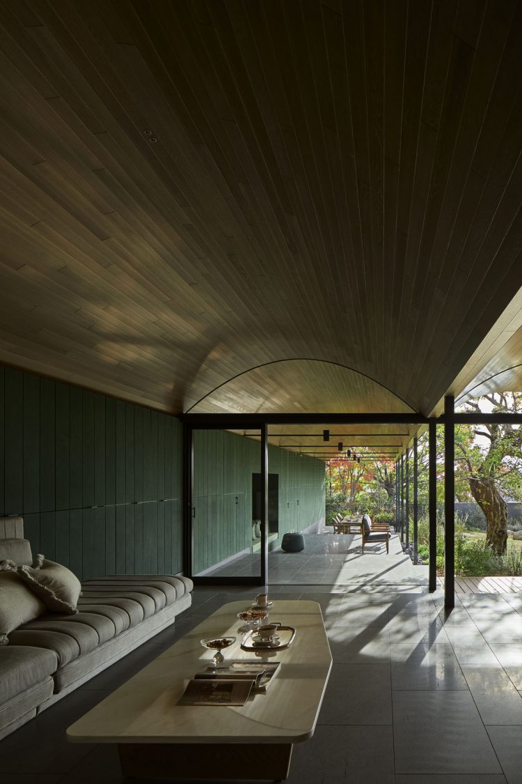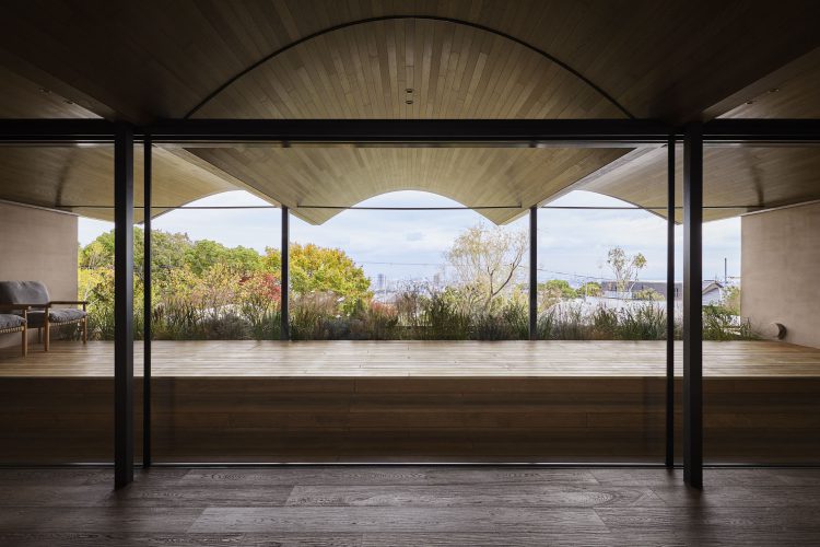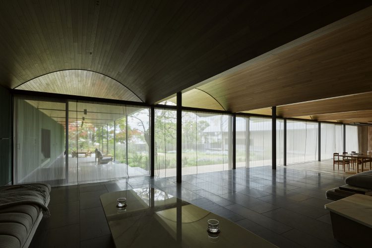 開放的な大空間と親密な小空間という、相反するふたつの空間が同時に存在する家である。人を大勢招くことができて見通しのよいLDKは散漫な空間にならないように、筒形ヴォールト屋根を頭上に低く浮かして緩やかに分節している。