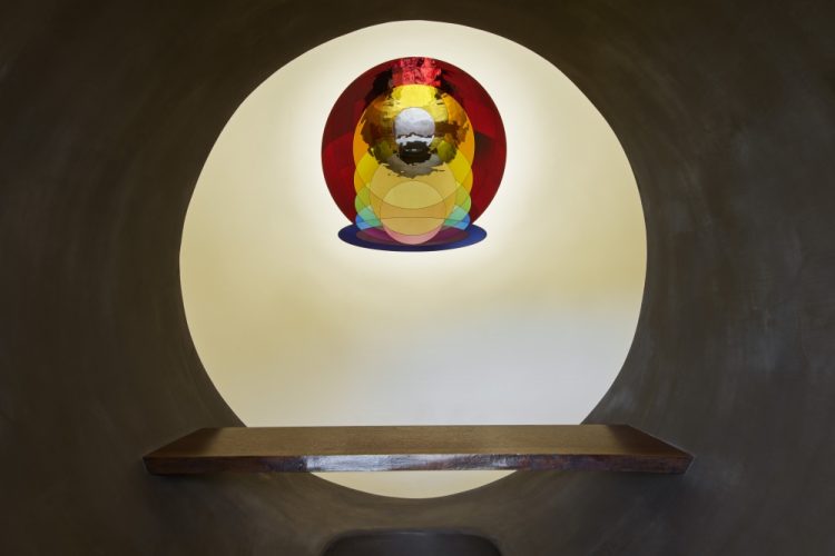 鏡の色ガラスで製作された作品には鑑賞者の顔が作品の顔の位置に浮かび上がり、自己と対話する空間となる。