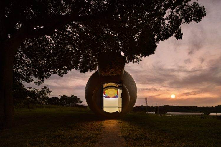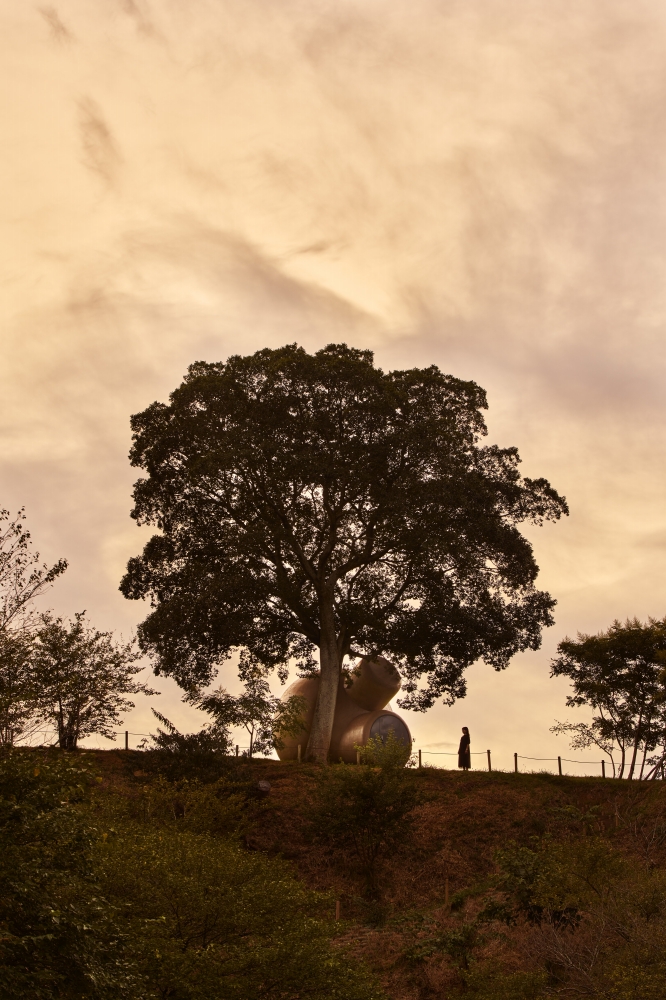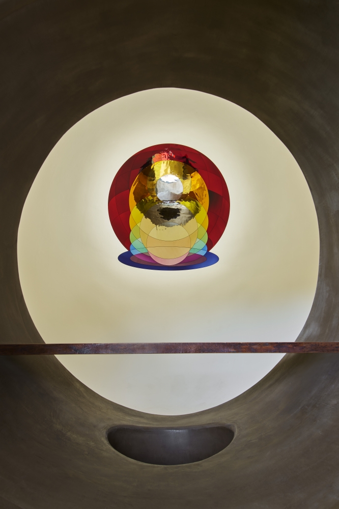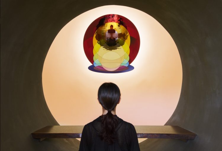球体内部には天体のように均質な光で満たされた全体野(ガンツ・フェルト)の中に、陽光によるハロー現象や光環が現れたかのごとく作品を展示した。アートの背後には日没の光を取り込む高窓を設置し、刻々と変化する西陽が後光のように人々を包み、日想観を体感できる瞑想空間となっている。