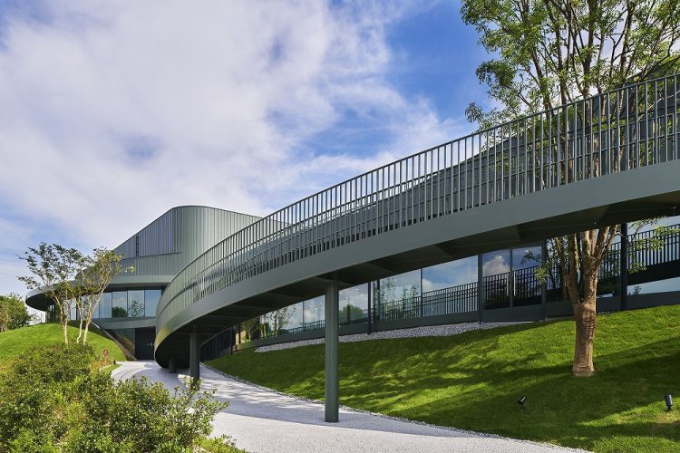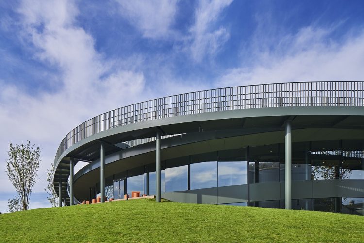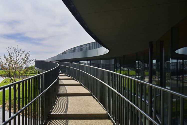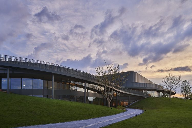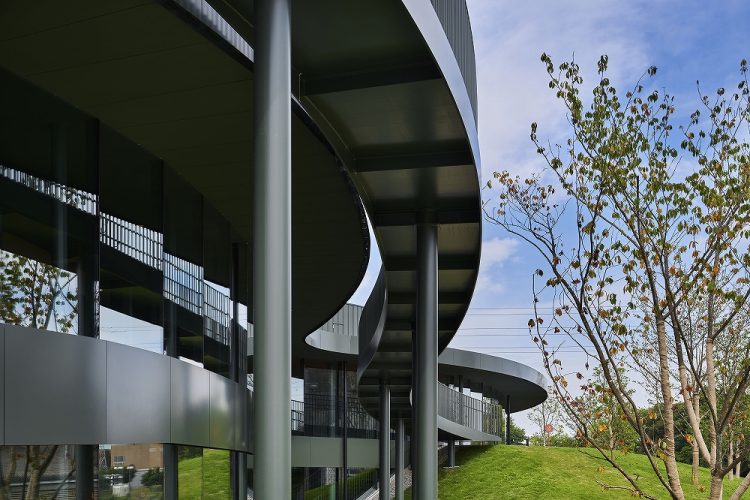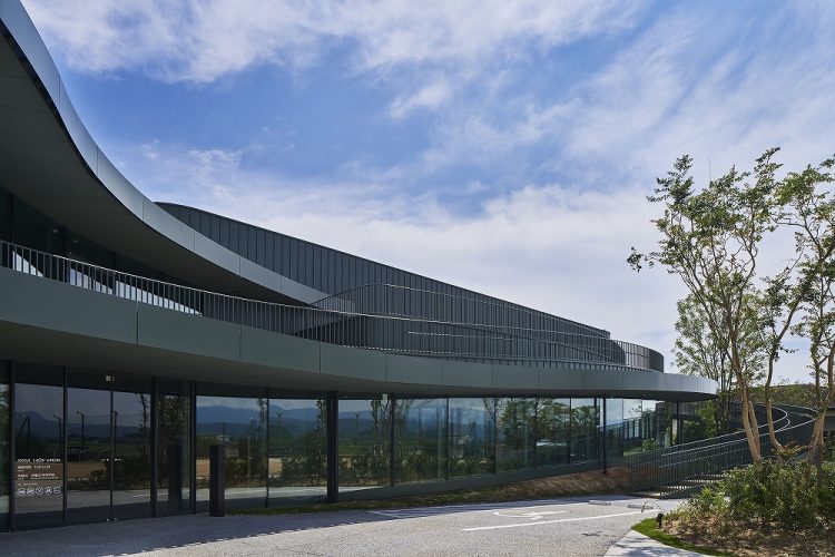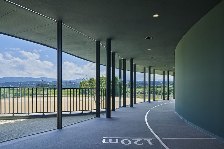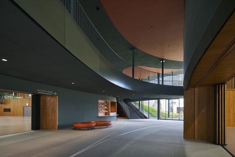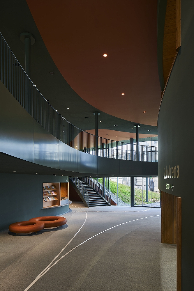 優良田園住宅促進地域に指定された敷地周辺は、大きな環境整備が構想されている。我々は周辺や隣接の保育所、生涯学習・保健福祉複合センターと将来的に連携できるよう、全方位アクセスと開かれた外観を求めた。ただしアリーナはボリュームが大きく威圧感がある上に、衝突や防眩のために堅牢な外壁を要する。そのためエントランスホールを除く1階の外壁を盛り土し、その丘を上がる緩やかな屋外通路を設けた。そして内部にはふたつのアリーナの外周を巡るなめらかな廻廊(以下∞廻廊)を設け、屋外通路が自然と内部につながる外観とした。