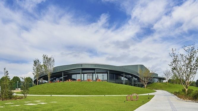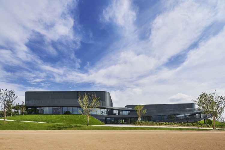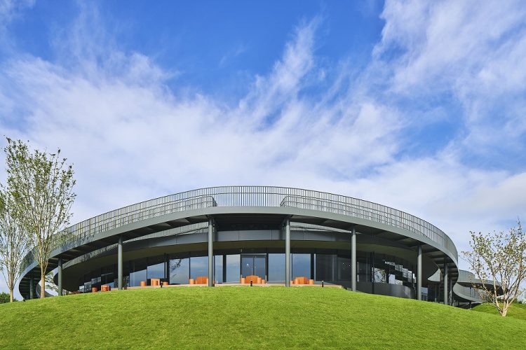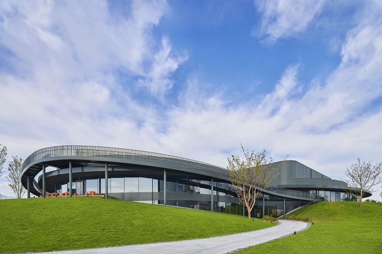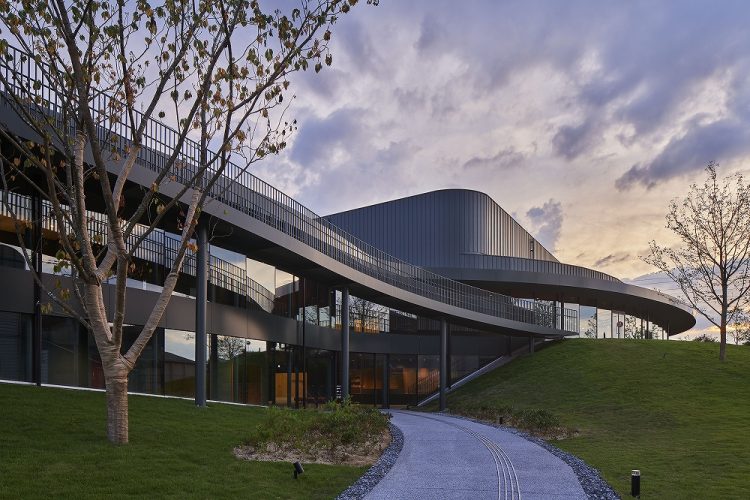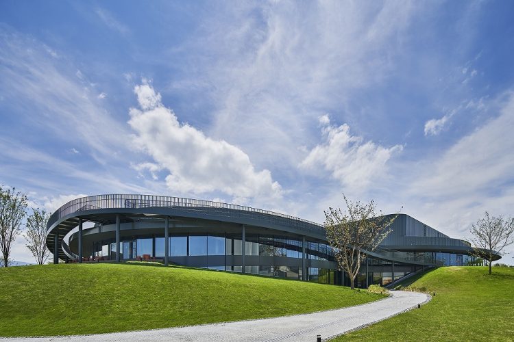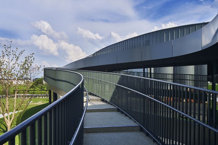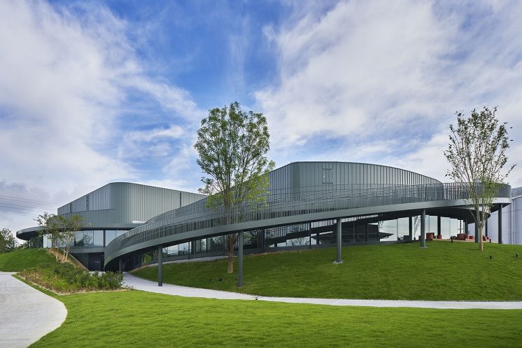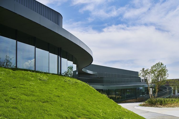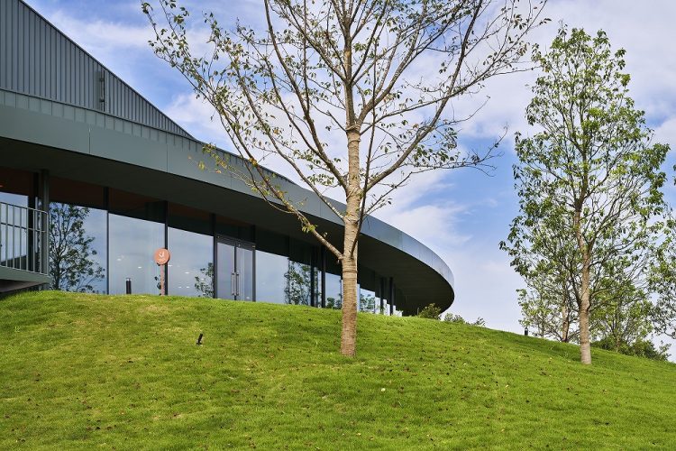 優良田園住宅促進地域に指定された敷地周辺は、大きな環境整備が構想されている。我々は周辺や隣接の保育所、生涯学習・保健福祉複合センターと将来的に連携できるよう、全方位アクセスと開かれた外観を求めた。ただしアリーナはボリュームが大きく威圧感がある上に、衝突や防眩のために堅牢な外壁を要する。そのためエントランスホールを除く1階の外壁を盛り土し、その丘を上がる緩やかな屋外通路を設けた。そして内部にはふたつのアリーナの外周を巡るなめらかな廻廊(以下∞廻廊)を設け、屋外通路が自然と内部につながる外観とした。