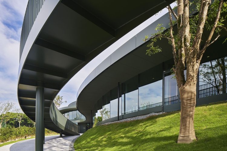 樹木を避けながら緩やかに上がっていく屋外廻廊