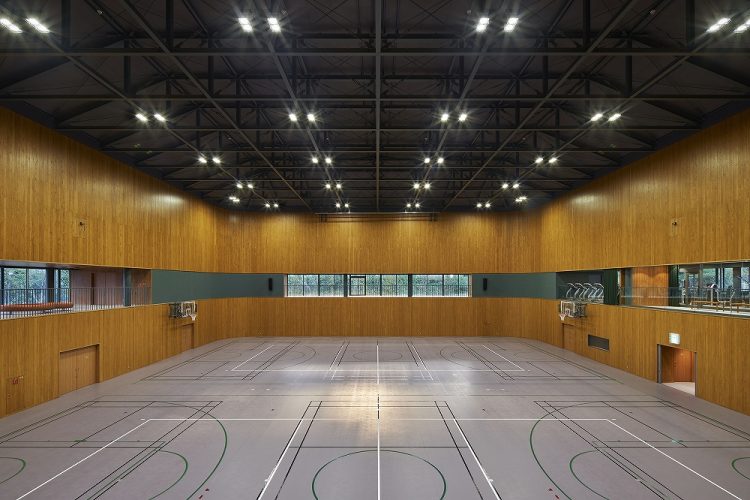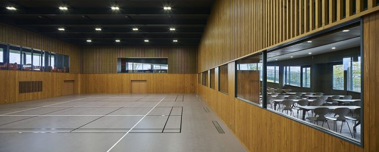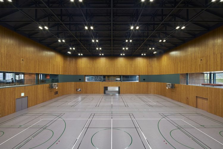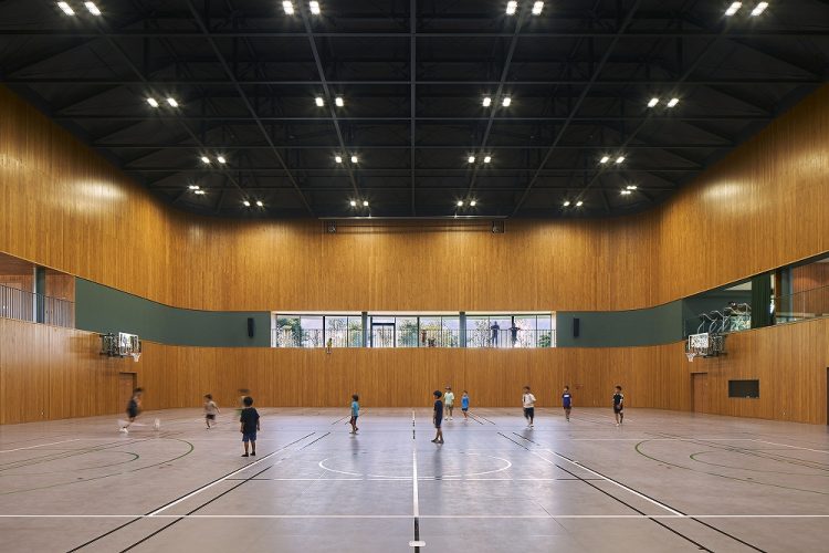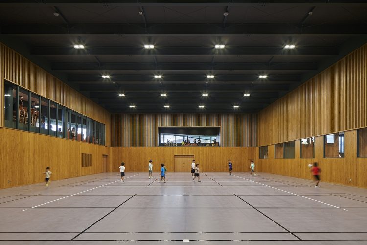 私たちが同じ動作を繰り返し体に染み込ませて、考えることなく素早く動けるように練習するのは、勝負のためだけではない。ボールや競技用具が身体の一部と化し、コートがテリトリーとなった時、自分の心と体、モノ、空間、場合によってはチームメンバーとが切れ目なく繋がったような感覚が立ち上がる。それはスポーツの語源通り、日々の生活から離れた楽しみなのである。この自由に一人ひとりが自分と向き合い、心と体をひとつにしていくスポーツ独特のふるまいを建築化できないだろうか。大きな空間であっても、ふるまいが定着することで身体性の高い空間ができ、建築と人、場所と人を分かち難く結びつけることができるはずだ。 福岡県上毛町から求められたのは、老朽化したトレーニングセンターと健康増進施設を集約し、生涯スポーツやコミュニティの拠点として、「地域との深い繋がり」を創造することだった。一般的に体育館は特定のスポーツの予約者以外を受け付けない閉鎖性がある。そこで従来の体育館機能に加えて、散歩や軽い運動、観戦もスポーツのひとつとして、幅広い年齢層の人びとが気軽に訪れて滞在・交流可能な体育館を目指した。