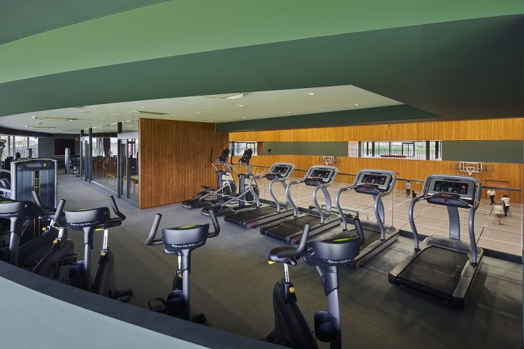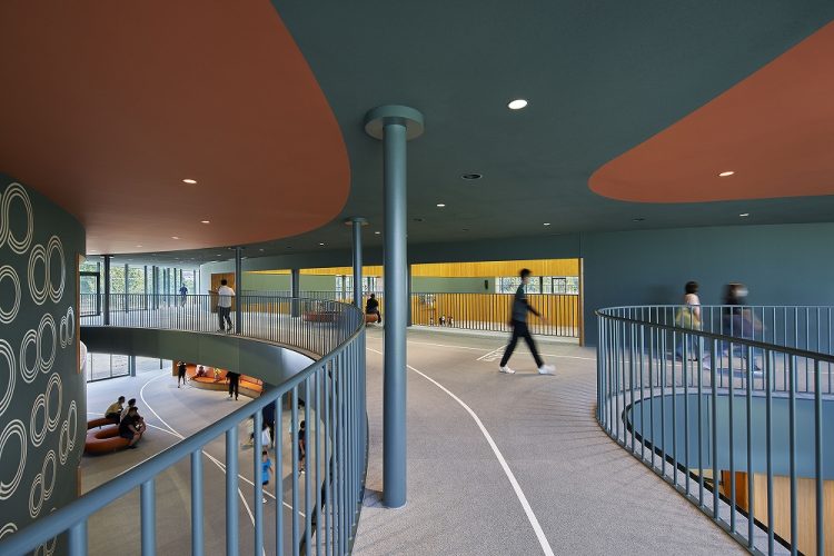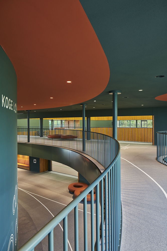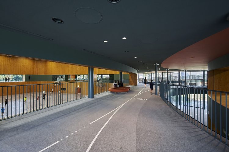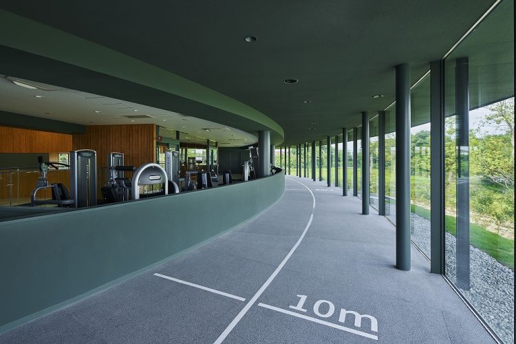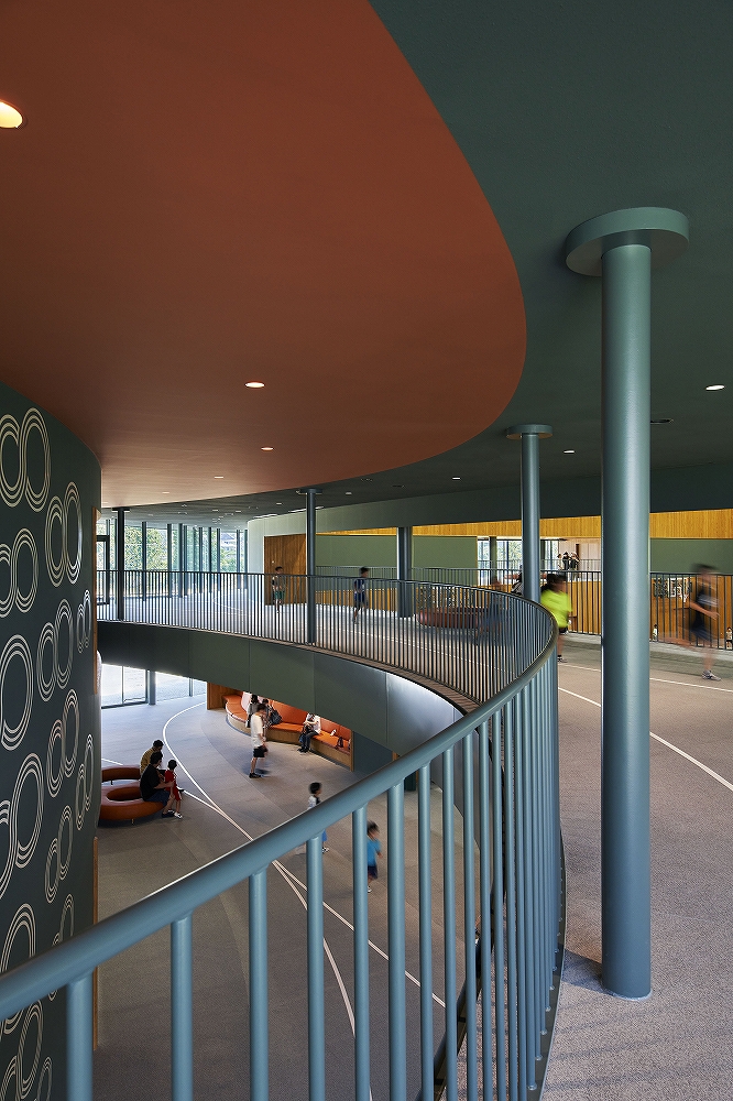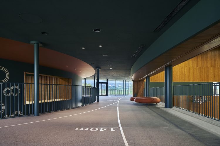 メインアリーナ側の1周150mのランニングコース。利用者が活動的になることを前提として、見通しが良い幅と半径により、衝突や怪我をしにくい設計へと発想を転換した。