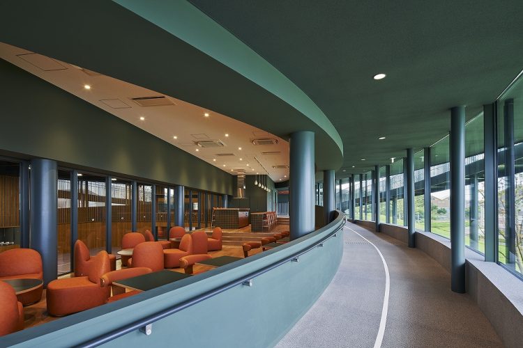 窓辺にベンチのある∞廻廊。カフェは観覧席としても利用できる。