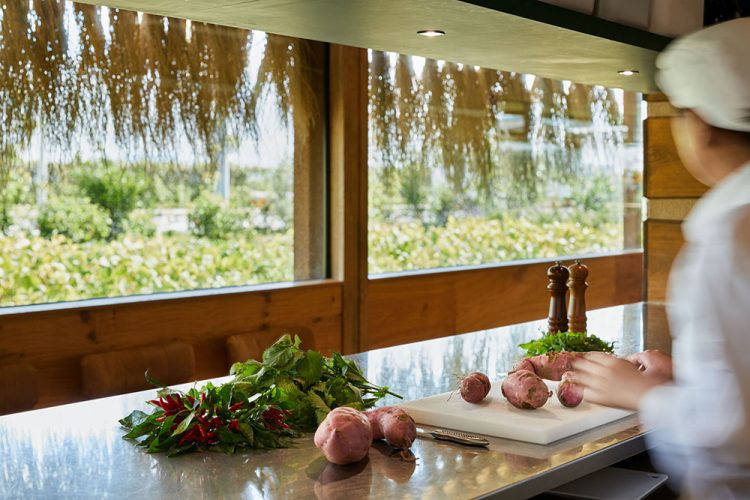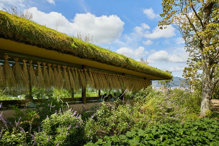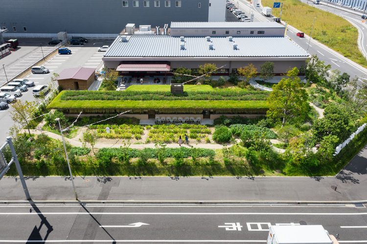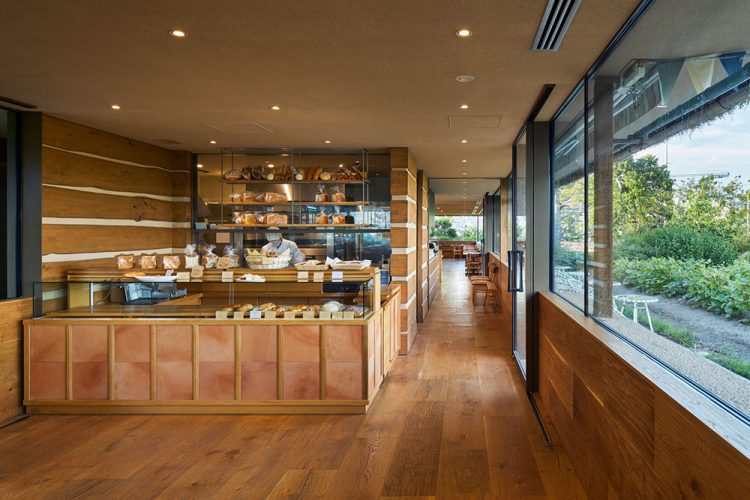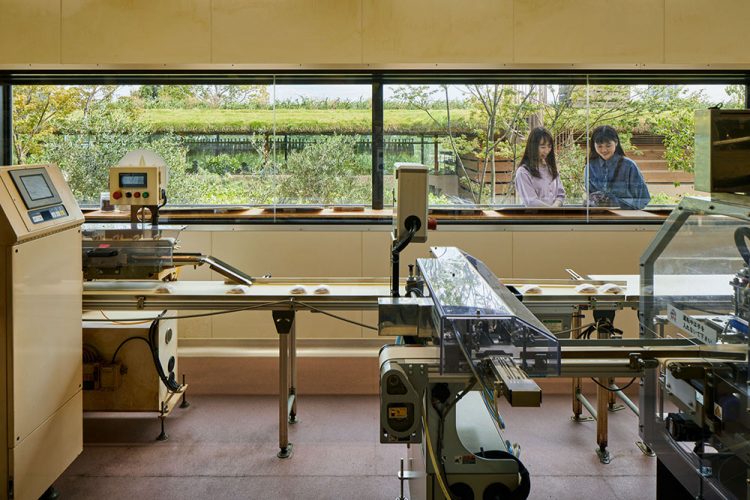まずは菓子の製造と工場見学にとどまらず、つくる人の顔や材料の確かさ、企業哲学を広く伝える場所となるよう、工場と同じ面積の農園「畑LABO」を設けた。畑には小豆や小麦、レモンなどの果樹、アーモンド、オリーブなどのお菓子の材料となる樹木を植えて、食材の研究や食育の場とした。畑中央のローズマリーの畝が続く大地は、それをそのまま切り取って上部に持ち上げて、その下を空間とした。内部の中心にはテストキッチンを据えて、食にまつわる研究や新商品の開発を行い、その両サイドにはここで考案されたお菓子やパンが並ぶショップや食事ができる場所がある。通常、「生産」「加工」「消費」の場といったようにゾーニングによって切り離されている工程が、ここでは一つのサイクルを持って存在している。