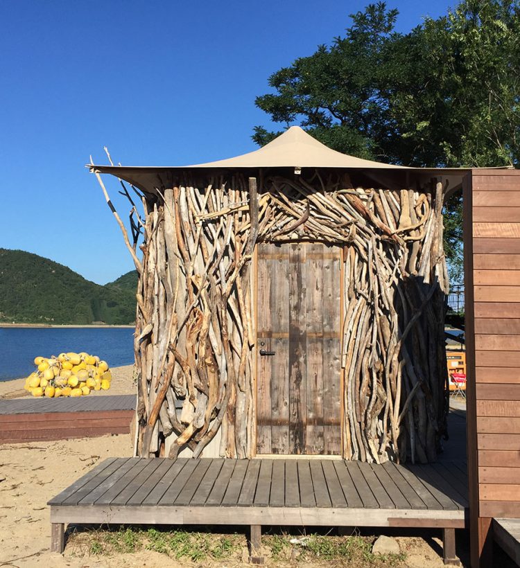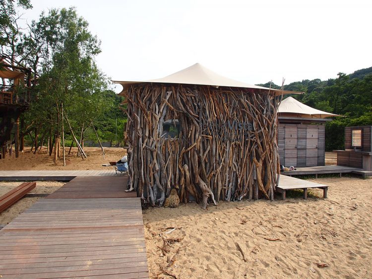 敷地は瀬戸内海に浮かぶ無人島である。そこに海水浴客が過ごせる空間を作ることになった。電気やガス、水道もなく、大きな重機を持ち込むことも難しい。最初に考えたのは、自分が無人島に流れ着いたら、どこにどんな居場所を作るだろうか、という事だった。それが最少の労力で安心感のある場所を作ることにつながる。すると蚊や獣がいる密林ではなく、海に近いけれども高潮や海風、暑い日差しに悩まされることのない場所に目がいった。それは浜辺に群生するエンジュの木立の中だった。そういえばロビンソン・クルーソーが最初に住処にしたのも木の上であった。