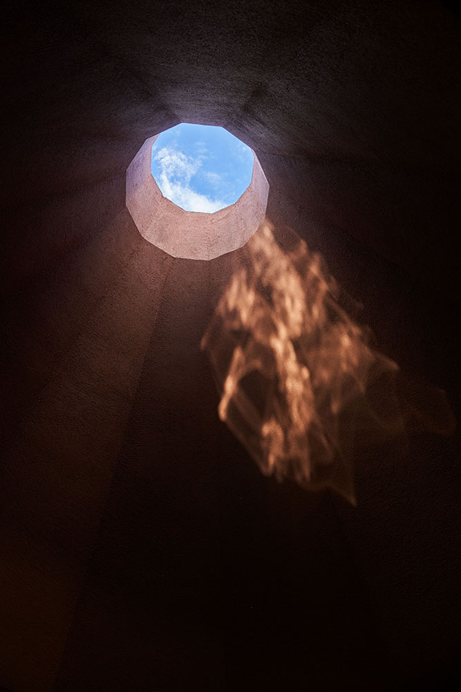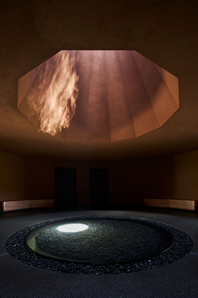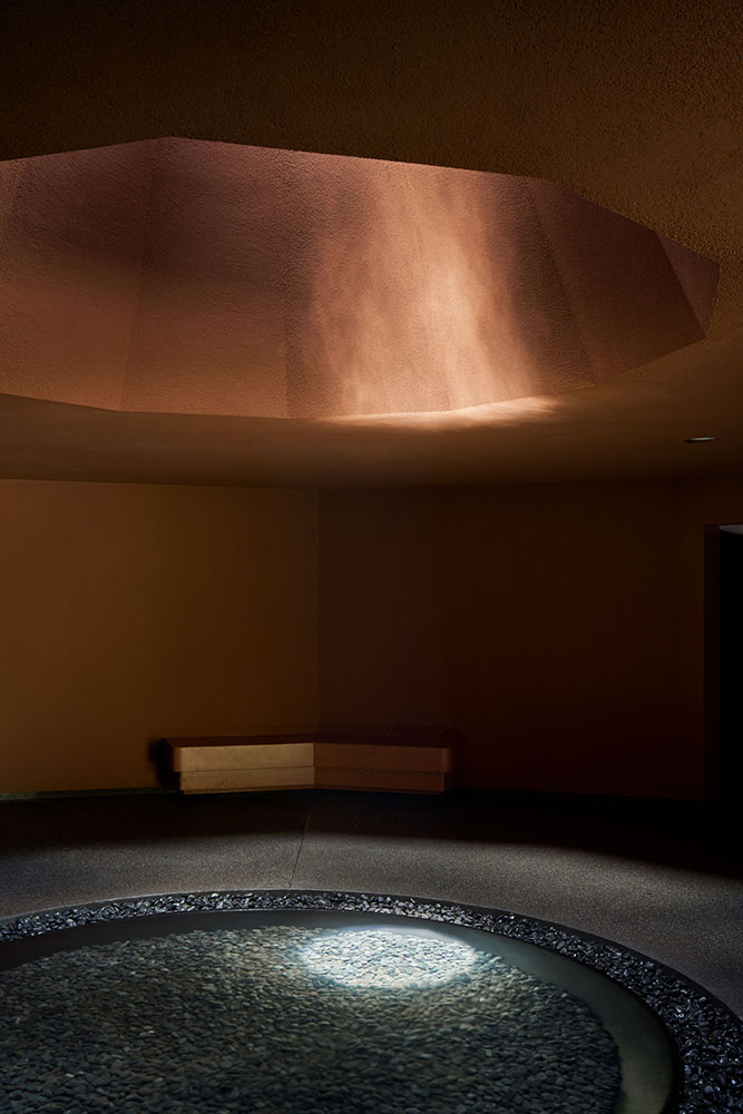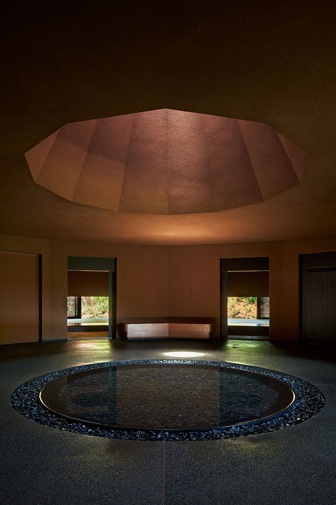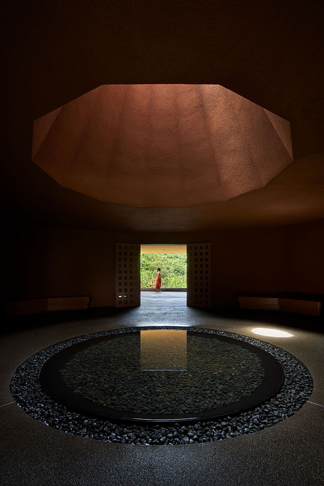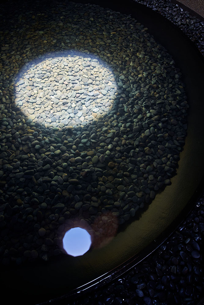 水の中庭は、気象庁の風向頻度統計と現地調査をふまえ、昼は海と崖下の川から吹き上がり、夜は山から吹き下ろす方位に抜けを設けた。中央の水盤には、外周部との温度差で涼しい風が通り抜ける。ガラスの入ってない天窓から雨や風が入り込み、太陽や雲によって照度が刻々と変化する内省的な空間である。静謐なホールの壁沿いのベンチに腰を掛けると、天窓からの光が天井に反射し、その水紋が風で揺らめく。私たちはそれを「子供の息吹」と呼んで、家族への励ましと捉えている。