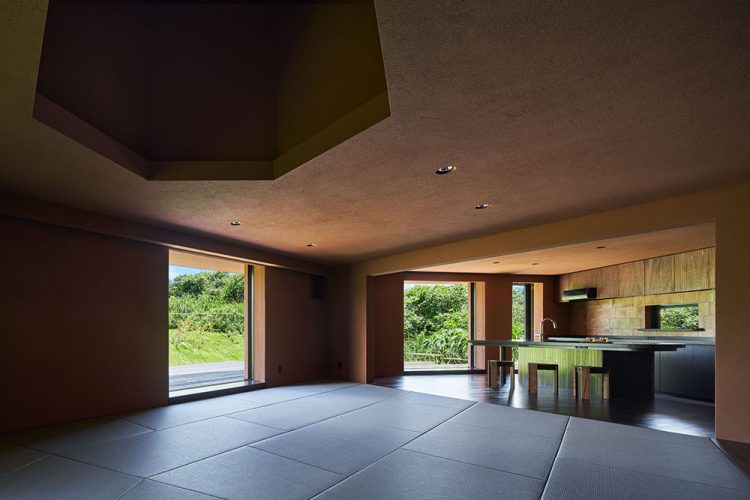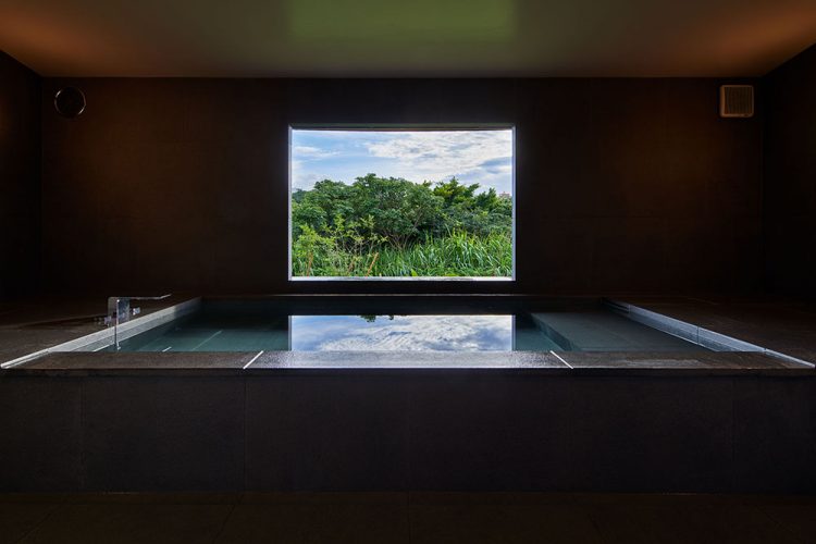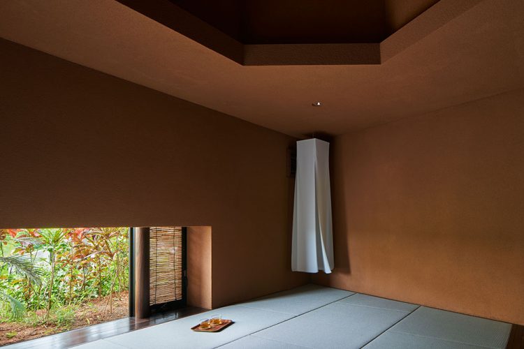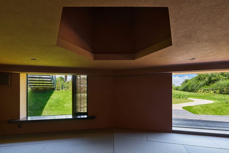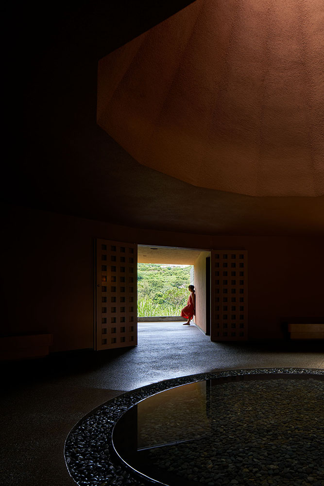 設計においてはまず、一日中寝たきりで天井や窓を見つめている子どもの身体に寄り添いたいと考えた。その子たちの目線や身体スケールに合わせて、横臥位でも外の景色や風を楽しめる掃き出し窓や、 低い入口と天井、そして仰向けになって見上げる中央には約1.8mの直径で奥行き8mの風突と高窓を設けた。これによって、日中上空で強い風が吹いている時は気圧差により、風突が室内の空気を上昇させ排気を促す。凪の時の客室では風突から暖気を逃がし、掃き出しの低い窓から北庭の日陰の空気を引っ張る煙突効果が生まれている。 体の自由が利かない子にとって、風はたくさんの情報を届けてくれる存在だ。松林を駆け抜ける海風、虫や鳥たちの鳴き声、琉球独特の花の香り、そして湿った潮や雨の匂い。このような「風の景」が、子どもと沖縄の風土を繋いでくれると考えた。プランは周辺環境に等しく開かれた円形で、どの部屋も外に面している。大浴場や皆が集うLDKは庭に大きく開かれた明るい部屋、4つのコンパクトな客室は少し暗めで、疲れやすい子が休むことができる静かな空間となっている。