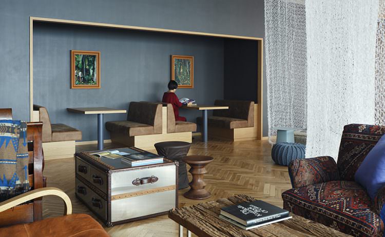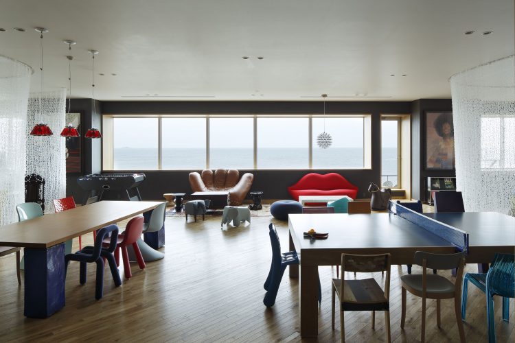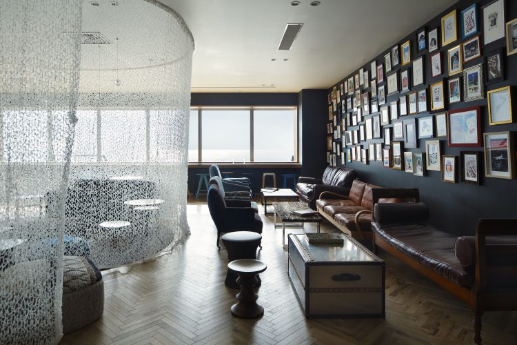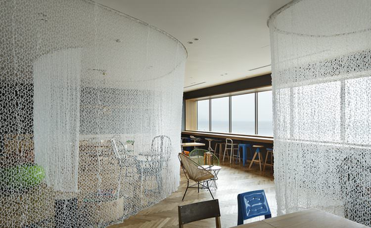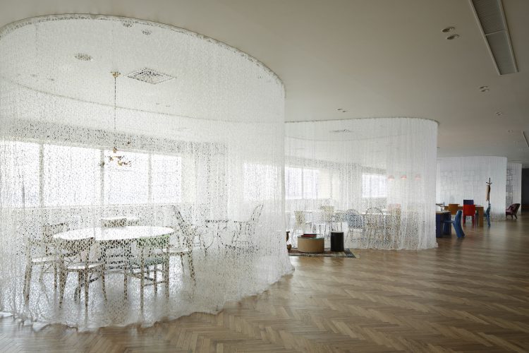 オンラインショッピングサイトの物流センター内のスタッフ休憩室である。クライアントからは、巨大な物流倉庫で立ち仕事をする従業員にとって、ゆったりと座ってくつろげる空間であること、そして集会を開くことが可能な柔軟なレイアウトであることが求められた。そこで木質系の空間をカーテンで細かく分節し、その内外に350種類の全て異なる椅子を配置した。巨大な空間に対して、服と建築の中間的存在としてのカーテンと家具が、人々をやさしく包み込むのである。