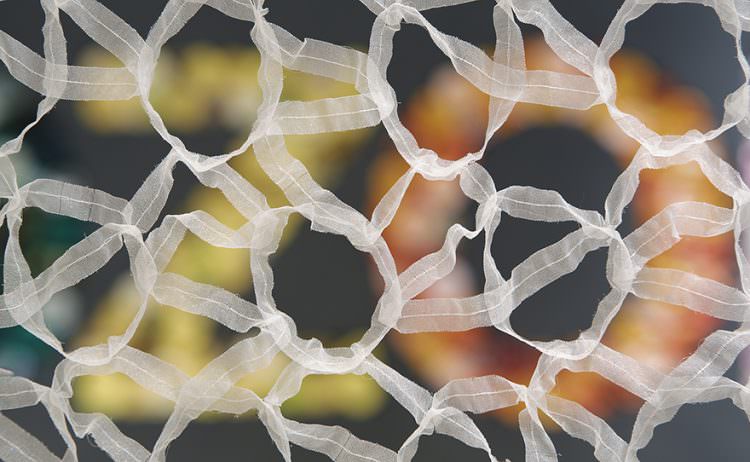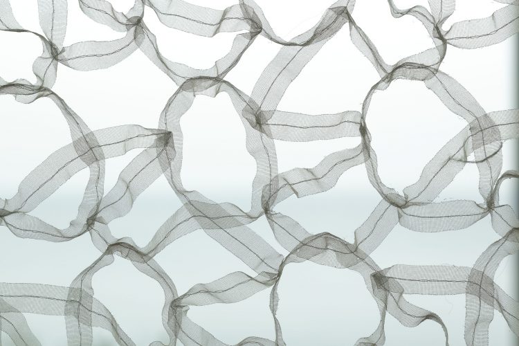 カーテンは既存の空調給排気口からほどよい距離をとって配置。吹き出し口からの風でカーテンが自然現象のように揺れ、美しい影を空間に落とすことを意図した。生地は幅9mmの半透明なオーガンジーリボンを使用し、一筆書きでZOZOというロゴの形で縫い合わせた。一本では弱くてもそれが集合すれば強い布になるカーテンが、企業の団結力を暗示している。ファッションに関わる人にふさわしい、布に対する繊細なふるまいも育つはずだ。